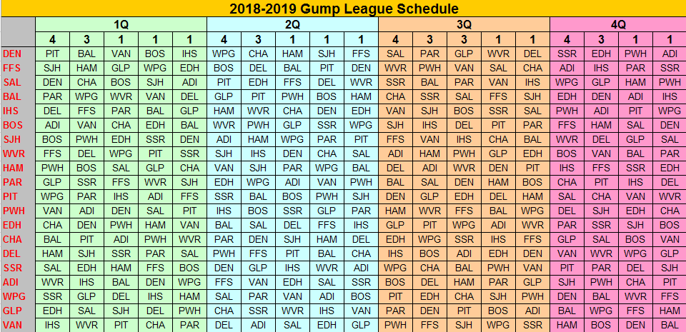 Left column denotes home team. Home opponents for each quarter are listed to the right. Number of games against each opponent is indicated by the numbers at the top.