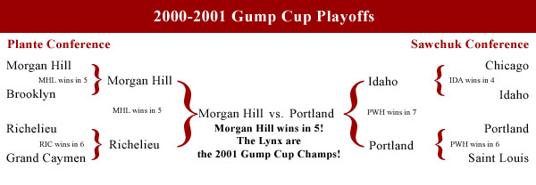 PLANTE CONFERENCE EAST DIVISION GP W L T GF GA Pts L10 RICHELIEU CARDINALS 82 48 24 10 255 182 106 8-2-0 BROOKLYN BLACKHAWKS 82 41 37 4 228 217 86 6-3-1 STATEN ISLE GEMS 82 36 39 7 225 272 79 3-7-0 STERLING EAGLES 82 33 38 11 228 243 77 7-2-1 BRIDGEWATER RANGERS 82 27 46 9 242 338 63 4-6-0 WEST DIVISION GP W L T GF GA Pts L10 MORGAN HILL LYNX 82 58 18 6 305 168 122 7-3-0 GRAND CAYMEN CONCH 82 48 21 13 326 221 109 6-1-3 S CAROLINA FIRE ANTS 82 35 37 10 215 220 80 2-7-1 COLORADO WILDFIRE 82 21 49 12 216 282 54 2-8-0 SOUTH PARK COWS 82 21 52 9 170 292 51 3-5-2 SAWCHUK CONFERENCE EAST DIVISION GP W L T GF GA Pts L10 CHICAGO WOLVES 82 48 26 8 293 226 104 6-3-1 SAINT LOUIS BLUES 82 35 36 11 248 236 81 4-5-1 MADISON RIVER RATS 82 28 48 6 212 275 62 7-2-1 KANSAS CITY 99'S 82 24 48 10 208 255 58 4-5-1 ANN ARBOR RAVENS 82 23 53 6 162 268 52 5-4-1 WEST DIVISION GP W L T GF GA Pts L10 PORTLAND WINTERHAWKS 82 57 19 6 330 180 120 6-4-0 IDAHO STORM 82 46 27 9 326 246 101 7-3-0 SACRAMENTO ZEPHYRS 82 40 30 12 272 240 92 5-2-3 DELTA STURGEON 82 37 36 9 237 252 83 7-3-0 VANCOUVER SEA OTTERS 82 25 47 10 187 272 60 3-6-1