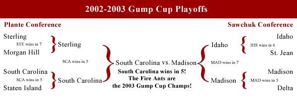 PLANTE CONFERENCE EAST DIVISION GP W L T GF GA Pts L10 STERLING EAGLES 82 52 24 6 279 195 110 8-1-1 STATEN ISLE GEMS 82 44 30 8 319 275 96 5-4-1 BROOKLYN BLACKHAWKS 82 35 37 10 227 239 80 3-5-2 CHESAPEAKE ICEBREAKERS 82 32 37 13 177 206 77 4-3-3 SAN DIEGO GULLS 82 28 44 10 216 261 66 3-6-1 WEST DIVISION GP W L T GF GA Pts L10 S CAROLINA FIRE ANTS 82 48 24 10 284 201 106 7-2-1 MORGAN HILL LYNX 82 49 26 7 271 210 105 6-3-1 SOUTH PARK COWS 82 37 34 11 209 225 85 7-2-1 ROSEMONT REVOLUTION 82 23 47 12 181 231 58 2-6-2 COLORADO WILDFIRE 82 22 50 10 169 246 54 2-7-1 SAWCHUK CONFERENCE EAST DIVISION GP W L T GF GA Pts L10 MADISON RIVER RATS 82 50 25 7 289 221 107 7-2-1 SAINT-JEAN WOLFPACK 82 44 29 9 274 208 97 3-4-3 SAINT LOUIS BLUES 82 44 30 8 260 210 96 6-3-1 KANSAS CITY 99'S 82 33 45 4 222 267 70 4-6-0 OREGON RUGRATS 82 22 51 9 198 335 53 1-8-1 WEST DIVISION GP W L T GF GA Pts L10 IDAHO STORM 82 61 18 3 360 180 125 7-3-0 DELTA STURGEON 82 39 30 13 237 212 91 5-4-1 SACRAMENTO ZEPHYRS 82 26 45 11 195 242 63 4-4-2 VANCOUVER SEA OTTERS 82 24 47 11 177 268 59 1-8-1 PORTLAND WINTERHAWKS 82 16 56 10 196 308 42 2-6-2