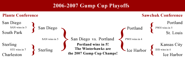 PLANTE CONFERENCE EAST DIVISION GP W L T GF GA Pts L10 SAN DIEGO GULLS 82 48 28 6 311 244 102 3-7-0 STERLING EAGLES 82 40 29 13 283 238 93 4-3-3 SALEM WANNABEES 82 38 34 10 270 278 86 5-3-2 ALTOONA RAILROADERS 82 34 41 7 292 311 75 4-4-2 CALIFORNIA SUN CATS 82 22 56 4 226 344 48 3-7-0 WEST DIVISION GP W L T GF GA Pts L10 CHARLESTON CHIEFS 82 40 36 6 290 285 86 7-3-0 S CAROLINA FIRE ANTS 82 38 36 8 295 266 84 3-6-1 SOUTH PARK COWS 82 38 36 8 243 244 84 2-5-3 EL DORADO LYNX 82 37 41 4 307 313 78 5-5-0 COLORADO WILDFIRE 82 34 42 6 309 335 74 5-4-1 SAWCHUK CONFERENCE EAST DIVISION GP W L T GF GA Pts L10 KANSAS CITY 99'S 82 47 26 9 297 246 103 9-1-0 SAINT LOUIS BLUES 82 47 29 6 304 243 100 4-6-0 W VIRGINIA RIVER RATS 82 33 42 7 301 338 73 4-5-1 OREGON RUGRATS 82 24 48 10 253 352 58 4-5-1 FARMINGTON FIGHT SAINTS 82 20 57 5 237 337 45 4-6-0 WEST DIVISION GP W L T GF GA Pts L10 PORTLAND WINTERHAWKS 82 60 16 6 410 256 126 8-2-0 ICE HARBOR STORM 82 47 29 6 334 250 100 5-4-1 DELTA STURGEON 82 42 30 10 313 286 94 5-3-2 VANCOUVER NIGHT TRAIN 82 33 43 6 295 325 72 4-6-0 SACRAMENTO ZEPHYRS 82 27 50 5 260 339 59 4-6-0