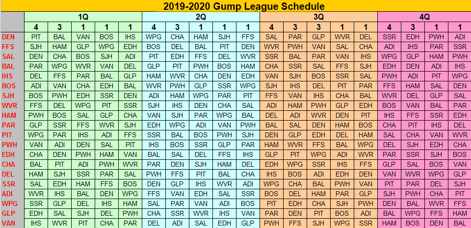 Left column denotes home team. Home opponents for each quarter are listed to the right. Number of games against each opponent is indicated by the numbers at the top.